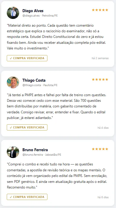 Sem problemas! O material é focado nos temas-chave da banca. Você não precisa cobrir todo o edital — apenas treinar as questões que realmente caem. Isso permite uma preparação eficaz mesmo com pouco tempo.